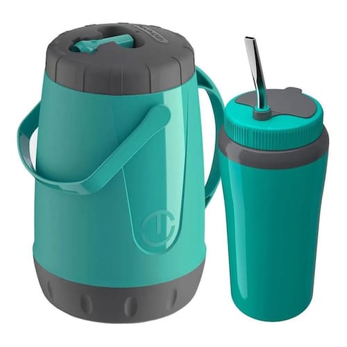 01 Garrafa térmica Unitermi 2,5 Litros com bico automático.01 Copo Térmico com bomba na mesma cor da garrafa térmica;Cor VerdeEssa garrafa foi feita especialmente para você que deseja utilizá-la no dia a dia. Seja para levar na piscina, na viagem, camping, pescaria e praia, e ter bebida quente ou gelada a sua disposição por onde quiser.Possui parede de isolamento térmico, conservando a temperatura de suas bebidas por mais tempo. É capaz de manter o gelo por até 12 horas, e bebidas quentes e frias por 8 horas. Um produto de excelente qualidade e alta durabilidade, de design moderno e belo.Possui bico dosador como sistema de despejamento do líquido que facilita a forma de servir a bebida e garante que a garrafa esteja sempre fechada, evitando vazamentos e a entrada de poeira e insetos. Além disso, possui uma borracha como método de vedação na parte interior da grande tampa, e um sistema de rosca firme para a abertura e fechamento da garrafa.- Vem com 2 alças, que facilitam o transporte e o momento de se servir.-- Modelo: Pávia.- Capacidade: 2,5L.- Isolamento térmico feito em Poliuretano PU .- Dimensões: Altura 26cm x Largura 16,5cm.- Peso: 500g.Cuia Térmica:- Conserva a temperatura por muito tempo, isolamento em Poliuretano.- Superfície lisa, fácil de limpar;- Produto com ótimo acabamento;- Capacidade: 650ml;- Tamanho: 23x8cm;Bomba:- Essa bomba é acoplada no copo térmico, de fácil montagem e muito prática. Possui grande durabilidade e é muito bonita;