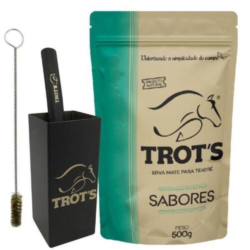 Kit tereré Trots Cuia Inox + Bomba Larga V8 Inox + 1 Erva Sabor: Tradicional Acompanha:01 Cuia Quadrada Preta da marca Trot's;01 Bomba Preta para Tereré, da marca Trot's;01 Erva Trot's 500g. Cuia: ATENÇÃO: Produto original. Acompanha nota fiscal e garantia. Feita para um amante de Tereré, essa cuia compacta e de alta qualidade serve para que você consiga curtir sua Erva Mate onde estiver, seja em casa, no trabalho, no campo ou na viagem. Com essa cuia você terá seu momento de lazer que todo fã de Tereré presaFeita de inox, não enferruja nem perde a cor. Se bem cuidada, pode durar por um longo tempo;Possui um design quadrado e superfície reflexiva, trazendo elegância. Além disso, a logo da Trot's se faz presente no copo, a deixando ainda mais estilosa;Dimensões: diâmetro de 5cm e altura de 11,6cm.Peso: 219g;Capacidade: 300ml;Material: aço inox. Bomba: ATENÇÃO: Produto é original e 100% inox. Acompanha nota fiscal e garantia. Essa bomba veio para que você aprecie o velho e bom Tereré, aproveitando melhor o sabor e a praticidade;Design achatado, é extremamente bonita e compacta, dessa forma você pode carregá-la para onde precisar de forma fácil e cheia de estilo, e curtir uma erva mate seja no trabalho, em casa ou reunido com os amigos;Tela de proteção interna que garante a passagem adequada de erva;Acompanha escovinha de limpeza para que consiga manter a bomba sempre limpa;Pode ser utilizada para chimarrão ou tereré;É feita de inox, ou seja, não enferruja nem perder a cor. Se bem cuidada, essa bomba é capaz de durar por muito tempo;Tamanho: bomba - 19cm;Largura: 1,8cmEscovinha de limpeza - 19cm;Material: aço inox; Erva: Atenção Todos os sabores são totalmente naturais, sem adição de açúcar, conservantes ou aromatizantes artificiais; O consumo moderado de tereré é comprovadamente uma prática que traz muitos benefícios a saúde e também uma excelente forma de se hidratar e aliviar o calor, ao mesmo tempo proporciona momentos agradáveis na hora de se reunir com os amigos para conversar e apreciar o bom e velho Mate. As Ervas Trots são consideradas uma das melhores do Brasil. Esse produto é original, vem lacrado em sua embalagem, acompanha nota fiscal e possui validade de 2 anos. Não contém glúten, dessa forma todos podem usufruir dessa erva;Embalagem resistente e com lacre de vedação pós abertura e anti luz, o que faz com que o sabor seja preservado;