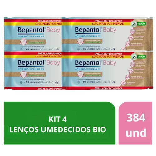 Kit com 4 Toalhas Lenços Umedecidos Biodegradáveis 4 Pacotes com 96un cada - Bepantol Baby