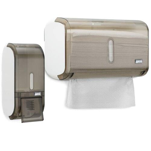 Kit toalheiro compacto premisse 2d fume + saboneteira compacta com reservatório 400ml Combo com 1 toalheiro compacto premisse urban 2d fume + 1 saboneteira compacta premisse linha urban com reservatório 400ml fume Sobre o toalheiro compacto premisse urban 2d fume Aparelho de alta tecnologia e inovação com a qualidade premisse. A linha de dispensers premisse urban possui design contemporâneo e moderno que combina linhas orgãnicas e retas facilitando a integração com o ambiente de uso. É confeccionado em termoplástico de alta resistência ao impacto. As paredes internas possuem geometria que inibem a umidade e poeira. Possui sistema de trava inteligente para abertura da tampa que inibe o vandalismo. Tem visor cristal transparente para melhor visualização do consumo e facilitar o abastecimento. Permite o uso de todas as marcas de papel existentes no mercado. Aplicação Verifique o local correto para instalar. O aparelho possui fita dupla face, limpe a áera com álcool, retire o liner protetor da fita e coloque o dispenser no azulejo; esperar 24 horas para que fixe bem. Dados técnicos - constituído em plástico com alta resistência ao impacto. - processo de produção por injeção termoplástica, garante uma melhor qualidade. - sistema de fechamento inteligente. - espaço interno com todas as paredes revestidas que garante mais higiene evitando umidade e poeira. Dimensões - largura: 24,3cm - altura: 14,7cm - profundidade: 12cm Sobre a saboneteira compacta premisse linha urban com reservatório 400ml fume A sabonteira premisse urban compacta foi desenvolvida para atender estabelecimentos, como escritórios, consultórios, residências e onde houver a necessidade de higienização. É um produto com design contemporâneo, que combina linhas orgânicas e retas e sua dimensões compactas facilitam a integração com qualquer ambiente. Possui reservatório para abastecimento de até 400ml de sabonete liquido. Aplicação Verifique o local correto para ser instalado, limpe a área com álcool, retire o liner protetor da fita e fixe o dispenser. Dados técnicos - constituído em plástico de alta resistência. - processo de produção por injeção termoplástica. - sistema de fechamento inteligente. - sistema com reservatório para abastecer. - tecla aperte com limite de curso, o qual garante eficiência na saída do sabonete com controle de quantidade. - espaço interno com todas as paredes revestidas que garante mais higiene evitando umidade e poeira. - visor central transparente para facilitar a visibilidade do sabonete, facilitando o abastecimento.