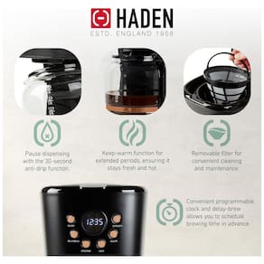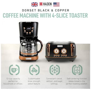 O kit Haden Dorset une a Torradeira Elétrica 4 Fatias com slots largos e a Cafeteira Elétrica Programável 12 xícaras, ambos em aço inoxidável com acabamento preto e cobre, projetados para máxima eficiência, precisão e durabilidade em ambientes residenciais. A torradeira possui quatro câmaras independentes com largos slots auto-centralizadores, ideais para diversos tipos de pães (bagels, fatias grossas, waffles) e função de centragem automática para distribuição uniforme do calor, assegurando torra homogênea. O controle variável de temperatura permite selecionar o grau de tostagem, com funções dedicadas para descongelamento e bagel, além de botão cancelar para interrupção instantânea do ciclo. A estrutura interna pintada em aço inoxidável aumenta a resistência térmica e facilita a higienização, complementada por bandejas coletoras de migalhas removíveis.