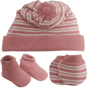 O terceiro item do kit são as luvas de tricot, que são projetadas para proteger as mãos delicadas do bebê. Elas são macias e confortáveis, permitindo que o bebê mova as mãos livremente enquanto permanece aquecido. As luvas também possuem um design encantador, combinando com o restante do conjunto e proporcionando uma aparência completa e harmoniosa.