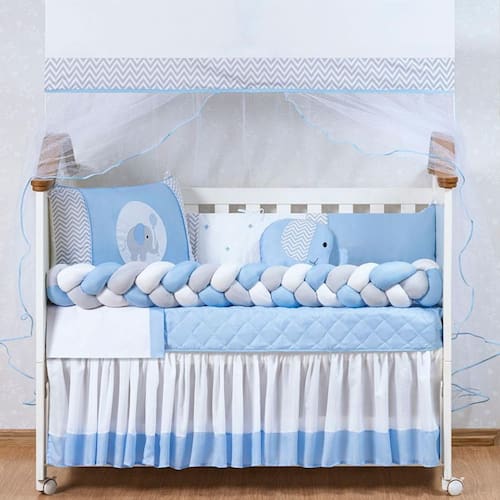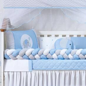 KIT DE BERÇO ELEFANTE 14 PEÇAS. Contém: 1 Travesseiro de algodão 100% silicone 40 cm x 30 cm. 1 Edredom 1,25 m x 75 cm. 1 Bandô de Mosqueteiro 1,40 m x 20 cm. 1 Mosqueteiro 4,60 m x 1,50 m. 1 Cabeceira 60 cm x 40 cm. 1 Lateral 1,25 m x 25 cm. 1 Trança 1,25 m x 12 cm. 1 Lençol 1,25 m x 95 cm 100% Algodão. 1 Trocador 50 cm x 40 cm. 1 Almofada Elefante 30 cm x 35 cm. 1 Saia box. 1 Lençol 1,20 m x 80 cm. 1 protetor impermeável de berço 1,50 m x 80 cm. Composição: Tecido estampado 100% Algodão. Tecido colorido 100% Poliéster. Tecido lençol 50% Algodão 50% Poliéster. Tule 100% Poliamida. Plástico 100% PVC. Enchimento 100% Poliéster. Edredom dupla face todo matelado com várias costuras. Laterais e cabeceiras com zíper para facilitar a lavagem de seu produto.
