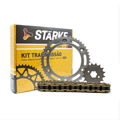 Para as motos rodarem tranquilas e apreciarem cada quilômetro, a starke criou o Kit Relação Transmissão Titanium. Feito em aço 1045, que possui uma presença maior de carbono, sendo mais resistente e seguro, ele conta com toda a durabilidade que você precisa para rodar tranquilo e sem problemas. Ele é composto por uma coroa, um pinhão e uma corrente.