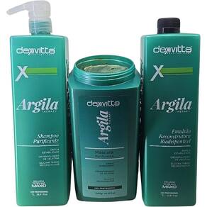 O Shampoo Argila Therapy Dexvitta foi desenvolvida com exclusiva formulação italiana para todos os tipos de cabelos. As propriedades da Argila Estabilizada fortalecem as fibras capilares, diminuem a queda, auxiliam no combate a oleosidade e promovem hidratação nos cabelos. Sua fórmula contém uma diversidade de oligoelementos que associados ao Crosspolimero de Gelatina e ao Silicone Termo Reconstrutor garantem efeito reconstrutor, nutritivo e hidratante aos cabelos. MODO DE USAR: Aplicar sobre os cabelos úmidos e massagear suavemente o couro cabeludo com movimentos circulares. Enxaguar em abundância e repetir a operação. Deixar em pausa por 3 minutos na segunda aplicação. Enxaguar abundantemente. PRECAUÇÕES: Uso externo. Não ingerir. Manter fora do alcance de crianças. Em caso de irritação, suspender o uso. No caso de contato com os olhos, lavar com água ===================================================== A Emulsão Reconstrutora Argila Therapy Dexvitta foi desenvolvida com exclusiva formulação italiana para todos os tipos de cabelos. As propriedades da Argila Estabilizada fortalecem as fibras capilares, diminuem a queda, auxiliam no combate a oleosidade e promovem hidratação nos cabelos. Sua fórmula contém uma diversidade de oligoelementos que associados ao Crosspolimero de Gelatina e ao Silicone Termo Reconstrutor garantem efeito reconstrutor, nutritivo e hidratante aos cabelos. ======================================================== A Máscara Argila Therapy Dexvitta foi desenvolvida com exclusiva formulação italiana para todos os tipos de cabelos. As propriedades da Argila Estabilizada fortalecem as fibras capilares, diminuem a queda, auxiliam no combate a oleosidade e promovem hidratação nos cabelos. Sua fórmula contém uma diversidade de oligoelementos que associados ao Crosspolimero de Gelatina e ao Silicone Termo Reconstrutor garantem efeito reconstrutor, nutritivo e hidratante aos cabelos. MODO DE USAR: Após lavar os cabelos com o Shampoo Argila Therapy aplique a Máscara Argila Therapy em toda a extensão dos fios, enluvando cuidadosamente mecha a mecha. Deixe agir por 10 minutos e enxague em abundância, Finalize como desejar