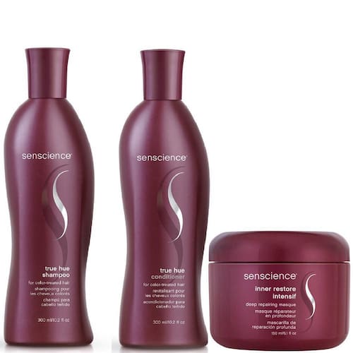 A Linha True Hue Limpa o cabelo com sua formula suave, sem agredir, mas que é extremamente eficaz. Desenvolvida para a preservação da coloração capilar, ajuda a condicionar os fios e protege dos raios solares. Seu cabelo fica limpo e com a cor desejada sempre.A Máscara Senscience é um tratamento de reparação profundo para cabelos grossos, com frizz e muito danificados. A Máscara Intensif nutri e rapara as cutículas deixando um brilho incrível no cabelo.ESPECIFICAÇÕES DOS PRODUTOSProtetores UV mantêm o cabelo protegido da radiação solar que causa o desbotamento ou a alteração da cor.Silicones Condicionantes proporcionam maciez e brilho sem se acumular nas fibras capilares.Poliméricos e umectantes;Aminoácidos essenciais.CONTEÚDO DA EMBALAGEM1 Shampoo Senscience Profissional True Hue 300ml;1 Condicionador Senscience Profissional True Hue 300ml;1 Máscara Senscience Profissional Inner Restore Intensif 150ml.MODO DE USOAplique o shampoo no cabelo molhado e massageie até formar espuma. Depois, enxágue. Aplique o condicionador no cabelo limpo e úmido, do comprimento às pontas. Deixe agir por alguns instantes e depois enxágue. Após lavar os cabelos com o shampoo, retire a água dos fios e aplique a máscara. Deixe agir por alguns minutos e enxágue.
