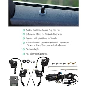 ESPECIFICAÇÃO TÉCNICA: - Modelo Dedicado; - Sistema de Chave ou Botão de Operação; - Mantém a O.riginalidade do Veículo; - Toque Elevado e Motor de Baixo Ruído; - Mono Serventia: A Porta do Motorista Comandará o Travamento e o Destravamento das Demais; - Trava e Destrava as Portas Através do Controle Remoto do Alarme¹ ou Através da Chave O.riginal; - Não Possui Travamento Automático; - Permite ao Transmissor do Sistema de Alarme o Fechamento e o Destrave das Portas Remotamente ao Armar u Desarmar-se; - Fácil Instalação; - Corrente Contínua de 12V – Terra Negativo. OBS: Não acompanha Alarme.