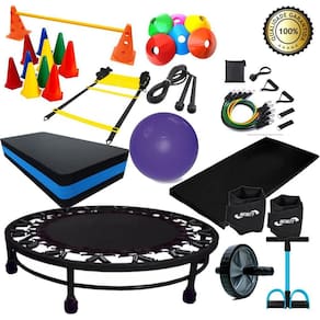 Kit Treino Funcional Completo para Exercício aeróbico Kit par treino em casa , queimar as gorduras em treinos aeróbicos e de fortalecimento O Kit é composto por: 1- MIni Jump 98 cm - 150Kg 1 Step em EVA 60x30x10 cm 1 Colchonete 1 Extensor Elástico com apoio aos pés 1 Escada de Agilidade 4,5mt com 10 degraus ajustável 1 Rodinha Abdominal 1 Corda de pular em PVC 5 Cones 23 cm 5 Pratos demarcatório 1 Kit cone - 2 cones furados + 1 bastão 1 Bola de Pilates 65 cm 1 Par de Caneleira 4 Kg 1 Kit elástico 5 vias Ean: 7890018706697