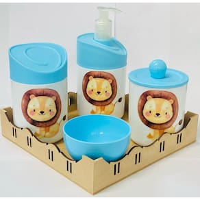 Kit Organizador para bebê c/bandeja em MDF. Cor do Pote: BRANCO PADRÃO Tampas: AZUL MATERIAL DOS POTES: ACRÍLICO MATERIAL DA BANDEJA: MDF Kit acompanha: - 1 bandeja de madeira em MDF. - 1 porta sabonete / álcool gel - 1 molheira - 1 porta algodão - 1 porta cotonete MEDIDAS DA BANDEJA EM MDF: Diâmetro: 19,5x19 cm Altura: 5x8cm MEDIDA DOS POTES: Porta algodão/cotonete: 8x10,5 cm Porta sabonete líquido: 12x21 cm Molheira: 8x5 cm Marca: Doya Kids