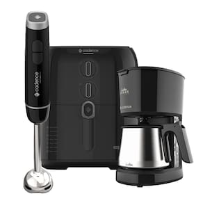 Kit Cadence Trio Black com Fritadeira Sem Óleo 4L, Cafeteira Elétrica Urban Pop Inox 1,2L com filtro permanente e jarra de inox, e Mixer Cadence Mixture Inox com 2 velocidades e 4 lâminas.