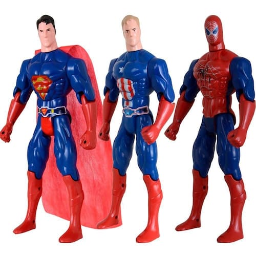1 Boneco Articulado Homem Aranha 29cm; 1 Boneco Articulado Super Man 29cm; 1 Boneco Articulado Capitão América 29cm;