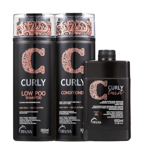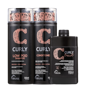 Kit de tratamento para cabelos cacheados e ondulados. Kit Truss Curly Low Poo Trio traz textura, definição e saúde aos cachos durante o dia a dia.