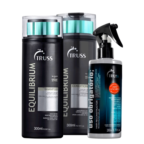 Kit de tratamento para cabelos mistos. Truss Equilibrium Obrigatório, traz shampoo, condicionador e um tratamento reconstrutor que juntos regulam o excesso de oleosidade na raiz e hidrata os fios na medida certa.