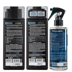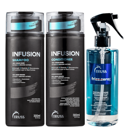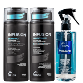 Kit Truss Frizz Zero Infusion com shampoo e 2 condicionadores. Indicado para cabelos danificados. Promove flexibilidade, fortalecimento e hidratação para fios mais resistentes e saudáveis, além de reparar intensamente.