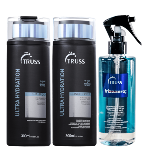 Kit Truss Frizz Zero Ultra Hydration com um shampoo e dois condicionadores. Indicado para cabelos danificados. Recupera o brilho, movimento e a maciez dos fios ressecados por danos do dia a dia, coloração ou químicas, além de reparar intensamente.