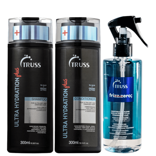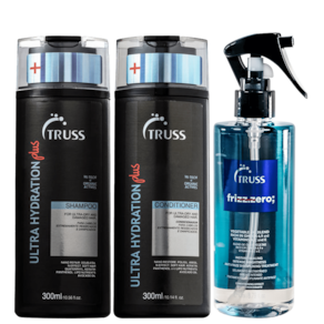 Kit com shampoo e 2 condicionadores para cabelos danificados. Truss Frizz Zero Ultra Hydration Plus devolve a hidratação perdida para fios mais macios, brilhantes e resistentes, além de reparar intensamente.