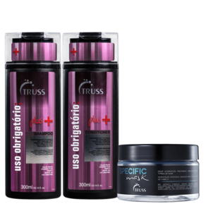 Kit com shampoo, condicionador e máscara para cabelos danificados. Truss Specific Uso Obrigatório Plus+ possui um poderoso efeito antiquebra, atuando na reconstrução dos fios desde o seu interior, além de reparar intensamente.