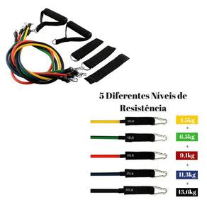 Contém: 01x kit elásticos extensores com 5 intensidades; 01x par de pegadores; 01x par de caneleiras; 01x trava de porta; 01x pequena bolsa para armazenamento.