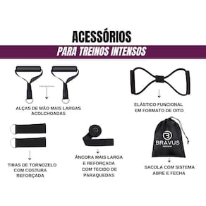 O kit Inclui: 5 Elásticos Tubing em 100 % látex natural, gancho largos em aço e tira em tecido de paraquedas e costura reforçada, sendo: 1 elástico de 4.5 kg de resistência 1 elástico de 9 kg de resistência 1 elástico de 13,6 kg de resistência 1 elástico de 18,2 kg de resistência 1 elástico de 22,6 kg de resistência 2 alças de mão revestidas de espuma 2 tiras para tornozelo 1 âncora para colocar na porta 1 bolsa em nylon 1 Elástico Extensor 8