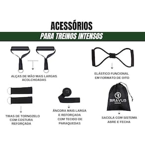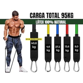 Kit Tubing PREMIUM EXTREME Elástico Extensor Carga Máxima Kit Tubing Premium Extreme - Carga Máxima 95 kg Acabamento Super Reforçado e Elásticos 100% Látex Natural Qualidade PremiumO Kit Tubing Premium Extreme Bravus Sport foi feito para os usuários mais exigentes e que buscam um produto de alta resistência para superar todos os limites e levar seu treino para outro nível. Combine 5 elásticos de diferentes resistências e crie diversos níveis de carga de acordo ao seu perfil de treino O elástico tubing antipressão é feito de material de qualidade premium, 100% látex natural, o que gera uma resistência dupla. Os mosquetões de aço resistente e as tiras firmemente costuradas também evitam o rasgo, mesmo sob a extrema resistência ao estiramento. O Kit Premium Extreme vem com 5 elásticos de borracha em forma de tubo duplamente reforçados, feitos de látex 100% Natural. Cada elástico tem 1,20 m de comprimento com garras em metal de alto calibre e que permitem um treino muito mais potente. O kit Inclui:1 elástico de 4.6 kg de resistência1 elástico de 9.0 kg de resistência1 elástico de 13.6 kg de resistência1 elástico de 27.2kg de resistência1 elástico de 40.8 kg de resistência2 alças de mão acolchoadas 2 tiras para tornozelo1 âncora para colocar na porta1 sacola de transporte Elástico Extensor Super 8Uma ferramenta de exercício físico versátil, o Elástico Extensor Super 8 é excelente para exercitar a parte superior e inferior do corpo e pode ser aplicado na yoga, pilates, levantamento de peso e até fisioterapia. Sua resistência permite isolar grupos musculares e trabalhar todo o corpo. Transforme seu corpo com exercícios de braço único e duplo super eficazes para o condicionamento total do corpo. O Elástico extensor 8 oferece resistência ao músculo e fornece os resultados que você procura.