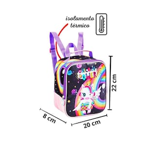Lancheiratérmica UnicórnioProduzido em poliésterPossui alças de costasMaterial interno térmicoZiperes com puxadores personalizadosEstampa estilizadaNão acompanha potinho e garrafinhaDimensões: 22 x 20 x 8cm alt x larg x prof ;Estojo unicórnio02 compartimentoDimensões: 15 x 21 x6 cm
