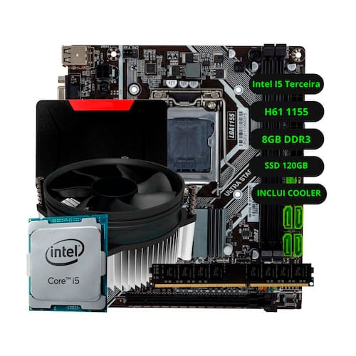 Placa Mãe: H61 Soquete LGA 1155 Memória RAM: 8GB DDR3 Memória RAM MAX: Suporta até 16GB Processador: I5 3ª Geração Cooler CPU TDP: 65W 2000rpm. SSD: 120GB SATA