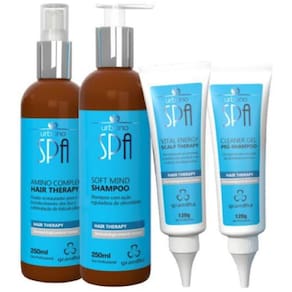 O Kit Urbano Spa Blue Hair Terapy é composto por: 01 Cleaner gel pré-shampoo 120g 01 Soft mind shampoo 250 ml 01 Vital energy scalp therapy 120g 01 Amino complex hair therapy 250ml Características - Combate à queda de cabelo - Equilíbrio hormonal e metabólico - Combate a oleosidade excessiva - Terapia capilar - Controle hormonal do couro cabeludo Especificações Marca: Grandha Linha: Urbano Spa Blue Tipo: Hair Therapy Ação: Combate à queda de cabelos Categoria: Terapia e Couro Cabeludo Conteúdo: 4 produtos Princípios Ativos: Argila Verde, Ácido Hialurônico, Prodew-500 e Flavononas de Hortelã