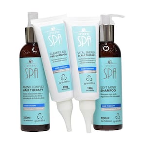 Kit composto por: Urbano spa blue amino complex hair therapy 250ml Urbano spa blue cleaner gel pre-shampoo 120g Urbano spa blue soft mind shampoo 250ml Urbano spa blue vital energy scalp therapy 120g