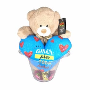 Lindo ursinho de pelúcia para você dar a quem tanto gosta e te admira!DÊ ESSE CARINHO NOS DIAS DOS NAMORADOS OU NUMA DATA ESPECIAL!Urso na cor marrom claro no tamanho, em pé, de 38cm. Acompanhando um balde de gelo de 5 litros, almofada em pelúcia no tamanho 28x34 e 8 chocolates, sendo 4 sonho de valsa e 4 ouro branco.* Acompanha na caixa, laço fácil e folha de celofane para embalagem!