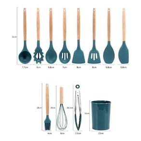 Kit Utensílios Cozinha 12 Peças Silicone Linha Premium Cor: Azul-turquesa Design, aderência, conforto, sustentabilidade e silicone térmico Linha premium Com material de alta qualidade, esse lindo kit utensílios foi projetado de forma altamente ergonômica em bamboo e silicone resistentes a altas temperaturas. Além de lindos e resistentes, são confortáveis e não transferem calor para suas mãos. De resistência excelente, silicone que suporta altas temperaturas (230C), diferente de produtos parecidos que derretem facilmente ou gradualmente. Um produto que vem com a qualidade que você com certeza vai querer ter na sua cozinha. Com 12 peças, capaz de atender a todas as suas necessidades na cozinha, são utensílios antibacterianos, livres de cola, atóxicos, antiaderentes, fáceis de limpar e armazenar. Os utensílios são totalmente livres de BPA. CARACTERÍSTICAS Design: Aderência, conforto e silicone térmico; Suavidade: Maciez, proteção para panelas antiaderentes; Durabilidade: Resistente a altas temperaturas, não deforma e não resseca; Segurança: Material atóxico, não cria bolor/fungos e possui silicone de alta qualidade que não deixa gosto ou odores nos utensílios; Conveniência: fácil de limpar, sem ruídos ao encostar em panelas e outros utensílios. ESPECIFICAÇÕES TÉCNICAS: Composição: Bamboo, Silicone Térmico de Alta Qualidade e Inox Cor Principal: Azul Turquesa Número de peças: 12 Temperatura Suportada: de -40C até 230C Peso Bruto: 1,20Kg Tamanho da Embalagem: 33 cm x 12,5 cm x 12,5 cm ITENS INCLUSOS: 1 Concha 1 Colher Rasa 1 Colher Redonda Funda 1 Colher Redonda Vazada 1 Espátula Grande 1 Espátula Lisa 1 Espátula Vazada 1 Pegador para Massa 1 Batedor Fuê 1 Pinça/Pegador em inox 1 Pincel 1 Balde Suporte Um único kit para todas as necessidades culinárias diferentes.Se você ama cozinhar, você vai adorar estes utensílios de alta qualidade