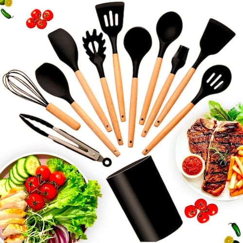 Kit Utensílios Cozinha Silicone Colher Copo Suporte 12 Peças Kit 12 Peças Utensílios de Cozinha em Silicone
