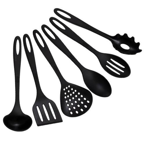 Sua cozinha estará completa e pronta para preparar diversas delícias com total praticidade. Kit de Colheres 6 peças, fabricadas em Nylon super resistente, com cabos alongados que evitam acidentes e queimaduras durante seu uso. Colher de Arroz, Colher Vazada, Espátula, Escumadeira, Concha e Pegador de Massa, cada uma para funções e alimentos diferentes no uso diário. Furo nos cabos permite organização perfeita em ganchos, além de tamanho prático para guardar na gaveta da cozinha. Cozinhe para a família e amigos com maior agilidade e segurança!