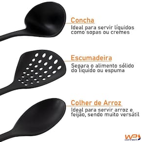 01 Espátula, 01 Escumadeira, 01 Colher de Arroz, 01 Concha, 01 Colher Vazada, 01 Pegador de Massa