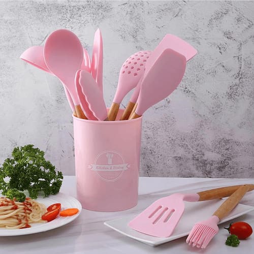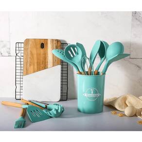 Kit utensílios de Cozinha de Silicone Kit Completo de Utensílios para Cozinha em Silicone que não danificam suas panelas e trazem total beleza para sua cozinha. O cabo de Madeira é bem rígido para ter segurança e praticidade no manuseio e preparo de receitas. Fácil de limpar e guardar. Conjunto excelente para o seu dia a dia.