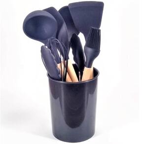 São 12 peças que compõem o Kit de Utensílios de Silicone Preto com Cabos de Madeira e Suporte