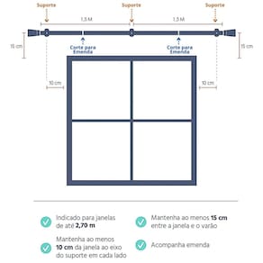 Qualidade Belchior Acompanha Manual de Instalação: Sim Ambiente: Quarto Ambiente Principal: Sala de Estar Comprimento do varão: 300 cm Cor: Cumaru Cor do Produto: Cumaru Espessura do varão: 28 mm Itens Inclusos: - 3 barras de 1,00m- 2 Emenda para Junção- 3 suportes- 2 ponteiras para acabamento do varão;- Buchas e parafusos para instalação; Linha ou Coleção: Linha Alemão Plus Local de fixação do suporte: Parede Manual de Especificação Técnica: https://product-hub-prd.madeiramadeira.com.br/954487/documents/dd86583b-56a3-4071-b25f-7be7fc9ba14b72244673574817242719395724.pdf Material da ponteira: Plástico Material do suporte: Plástico Material do varão: Aço Origem do Produto: Nacional Peso: 3 kg Recomendações de Uso, Manutenção e Limpeza: Para limpeza é indicada a utilização do espanador de pó ou pano levemente umedecido em água, seguido de pano seco. Não utilizar produtos químicos abrasivos na limpeza. Evitar impactos e contato com objetos cortantes. Tipo de kit varão: Simples