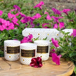 Kit com 3 Velas em vidro branco com detalhes em dourado e com acabamentos únicos, tornando a decoração de seu ambiente exclusiva e um presente de excelente gosto para todos os amantes de velas e decoração.