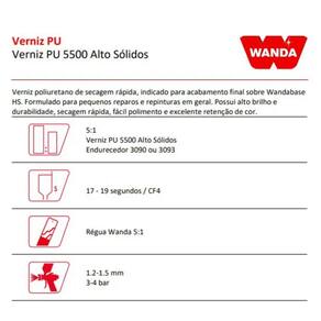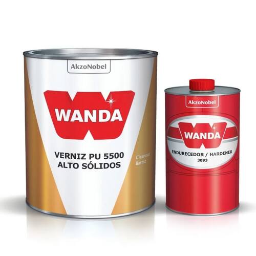 1 Verniz PU 5500 HS Wanda 750ml1 Endurecedor 3093 Wanda 150mlVerniz poliuretano de secagem rápida, indicado para acabamento final sobre Wandabase HS. Formulado para pequenos reparos e repinturas em geral. Possui alto brilho e durabilidade, secagem rápida, fácil polimento e excelente retenção de cor.
