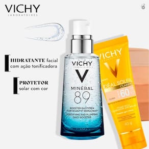 Kit com hidratante e protetor solar facial com cor. Kit Vichy Minéral 89 + Idéal Soleil Clarify FPS 60 Clara hidrata e fortalece a pele, além de uniformizar o tom com alta cobertura.