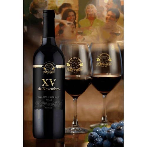 Kit vinho e 2 taças - xv de novembro presente namorados Kit vinho tinto suave 720ml +2 taças xv de novembro presenteKit vinho tinto suave + 2 taças + embalagem para presente - xv de novembro Vinho tinto de mesa suave, elaborado com cortes de uvas bordô 70% e isabel 30% . Característica: Vinho de coloração vermelho violáceo intenso e brilhante. Aromas persistentes e frutados, possuindo uma sensação de bom volume em boca, acidez equilibrada, paladar típico das variedades. Temperatura de consumo: Deve ser servido a uma temperatura de 10c a 12c. Graduação alcoólica: Teor alcoólico 10% vol. Volume: Disponíveis em embalagens de 720ml Harmonizações: Carnes grelhadas, risotos, massas e queijos.