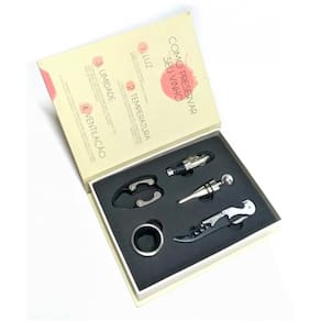 Kit para vinho formato de livro - 5 peças 1 saca - rolhas 1 anel salva - gotas 1 bico dosador 1 tampa de vinho 1 corta lacre Material: metal inoxidável Os verdadeiros apreciadores de um bom vinho precisam dos acessórios para degustá-lo de modo pleno. Kit de vinhos em um formato de livro belo e discreto.