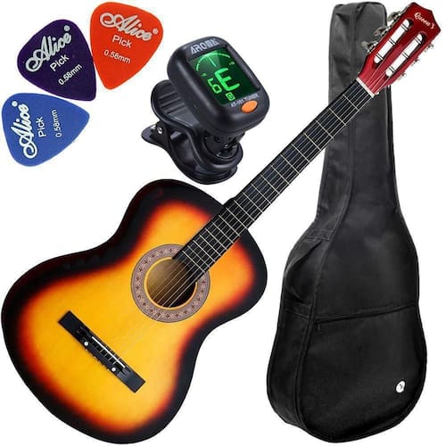 - tipo de violão: acústico - nível: iniciante - cordas: 6 - características do tampo: madeira birch - características do fundo e das faixas: fundos em madeira basswood - características do braço: madeira birch - escala: 19 - cavalete: 1 - quantidade de trastes: 19 - tarrachas: 6 - acabamento: verniz - cor: sunburst
