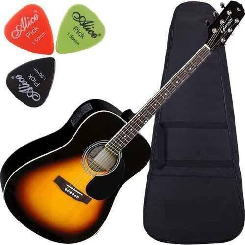 Características - modelo: violão dreadnought eletroacústico aço - tampo: basswood - faixa e fundo: agathis - braço: okoume com tensor bi-direcional - escala: rosewood - trastes: 21 em alpaca - marcação: madrepérola artificial escala e bolinhas pretas lateral - escudo: preto - tarraxas: blindadas cromadas 3+3 - captador es : k-8100 para rastilho - equalizador: gs-3t - controles: volume, bass, middle, treble, chave phase e tuner - saída: p-10 - acabamento: verniz brilhante