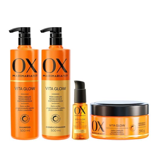 O Kit Vita Glow Mari Maria Ox 4 Unidades é indicado para cabelos ressecados e enfraquecidos. Isso se deve à combinação do blend de óleos ricos em vitaminas A, C, D, E, complexo B, ômega 3 e 6 com o Sistema OX Beleza Duradoura, a fórmula certa para nutrir os fios e auxiliar no crescimento saudável dos cabelos.