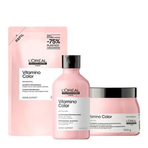 L'Oréal Professionnel Serie Expert Vitamino Color Máscara Capilar 250ml: promove proteção da cor, hidratação e luminosidade para os fios. Seu principal ingrediente, o Resveratrol, é um poderoso antioxidante presente na casca e nas sementes das uvas, que tem a função de preservar a cor dos cabelos por mais tempo. O resultado é um cabelo com 8 semanas de proteção da cor e 7x mais brilho.