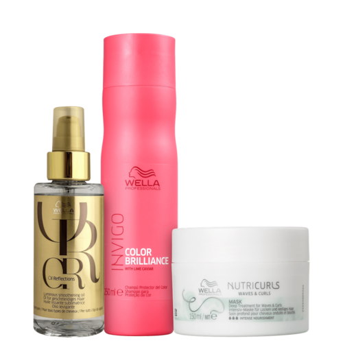 O Kit Wella Professionals Invigo Color Brilliance Nutricurls Oil Reflections Trio fecha as cutículas dos fios, permitindo melhor retenção da coloração, resultando em cabelos limpos, brilhantes, macios e com cor duradoura. Rico em ativos nutritivos e suavizantes, com tecnologia Nourish-in, combate o frizz, marca as curvas e protege os fios durante processos químicos, proporcionando maciez e maior nutrição.
