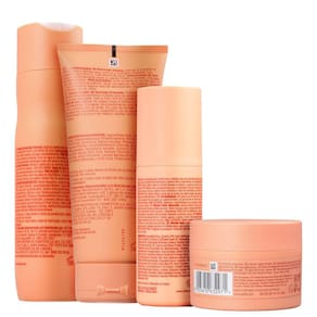 Aplique o shampoo sobre o cabelo úmido. Massageie suavemente e enxágue. Caso necessário, repita o procedimento. Em seguida, passe a máscara sobre o cabelo limpo e úmido. Distribua pelo comprimento e pontas dos fios e deixe agir por 5 minutos. Enxague. Depois, espalhe o condicionador no cabelo limpo e úmido, pelo comprimento e pontas. Deixe agir por alguns instantes e, em seguida, enxágue bem. Por último, aplique uma porção do leave-in, equivalente ao tamanho de uma noz, pelo comprimento e pontas dos fios úmidos. Não enxágue. Finalize como preferir.