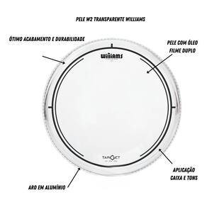 As peles da série Target são feitas com 2 camadas e filme 7 mil e conta com um agente liquido redutor de harmonicos e sobretons aplicado entre as camadas, proporcionando maiores ataques sem sobras, a Williams Drumheads tem caracteristicas de tons quentes, brilhantes e ataques abertos com sustain controlado.