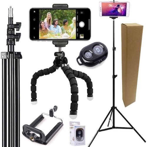 Kit youtuber tripé celular smartphone câmera pedestal + tripé flexível + controle bluetooth universal Kit ,completo,de qualidade.São itens para melhor qualidade de seus vídeos e fotos. O kit contém: 1 tripé de até 2,10m de alcance para celular ou câmera. 1 mini tripé flexível 1 controle bluetooth 1 suporte adaptador de celular para usar nos tripés Tripé robusto de alta qualidade, possui molas internas para amortecimento, braçadeiras reforçadas em nylon, altura de 2,10 mts, abertura dos pés de 88 cm promovendo boa estabilidade, pino 5/8 com rosca 1/4 para usar diversos tipos de equipamentos.Pintura preta, tornando - o mais discreto no ambiente de cine & foto.Reforçado, chegando a suportar 6 kg , pode ser com diversos equipamentos de iluminação. acompanha suporte adaptador de celular para usar nos tripés . Além disso este tripé é um modelo muito recomendado para utilização junto a equipamentos fotográficos e iluminação, uma vez que possui uma estrutura resistente com composta por materiais de alumínio e partes plásticas, conseguindo alcançar uma altura máxima de 2,10 metros e mínima de 50cm quando totalmente fechado, pesando somente cerca de 780 gramas, sendo portanto, carregado com muita facilidade e praticidade.O tripé de iluminação tpi-200 ainda possui 3 seções e 3 travas, que proporcionam ao usuário uma regulagem na altura, de forma que possibilite ao mesmo criar diversos modos de uso, conforme a necessidade de operação em cada um de seus trabalhos. Disparador bluetooth 3.0o controle remoto bluetooth é um acessório que permite que você desfrute o prazer de tirar fotos e também iniciar e finalizar vídeos,permitindo que obtenha imagens mais nítidas, evitando a vibração da câmera. Compatível com a maioria dos aparelhos com tecnologia bluetooth.É um produto que foi desenvolvido para facilitar a vida dos usuários de smartphones que adoram tirar aquela selfie sozinho ou com a galera. Com ele, você pode facilmente tirar fotos ou fazer vídeos sem precisar tocar no seu aparelho. Homologação Anatel: 060792000160