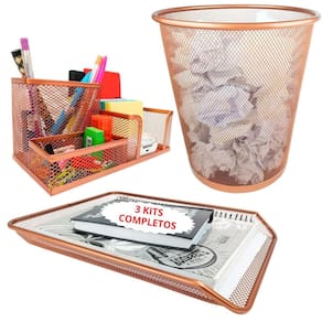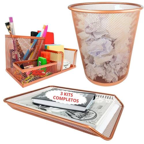 Kit organizadores de escritório composto por: - 03 lixeira aramada rose gold 10l - 03 bandeja organizadora simples rose gold - 03 organizador de mesa com 3 partições rose gold